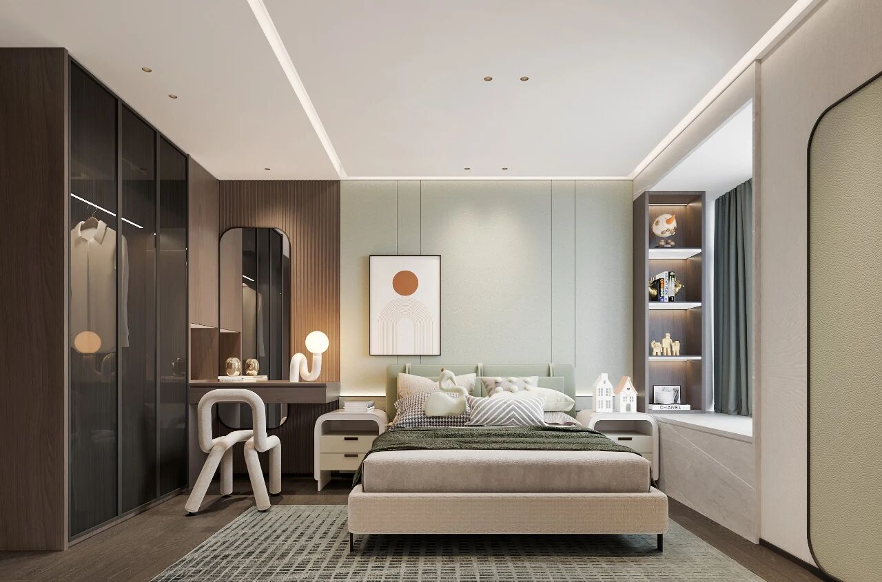 主卧以浅薄荷绿墙面为底色,搭配原木色柜体与奶油白软装,打造出如沐春风的轻氧氛围。弧形线条的梳妆台与不规则吊灯增添灵动细节,整面墙的玻璃衣柜既满足收纳需求,又让空间更显开阔。