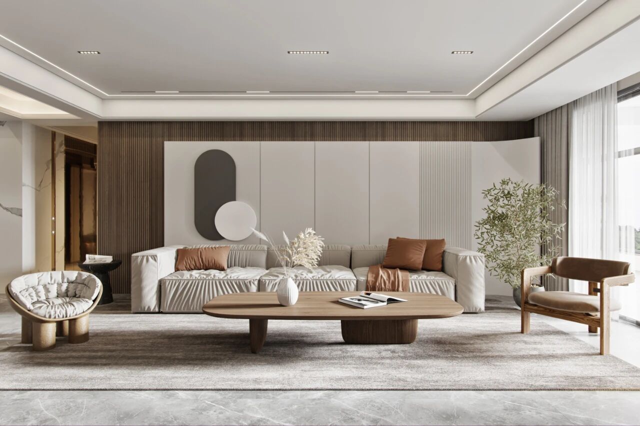 侘寂风客厅:浅米灰色的布艺沙发自带褶皱肌理,搭配原木风茶几与不规则造型休闲椅,营造出慵懒随性的氛围。背景墙采用木饰面与哑光墙板拼接,点缀极简几何挂画,让空间在质朴中透出高级感。