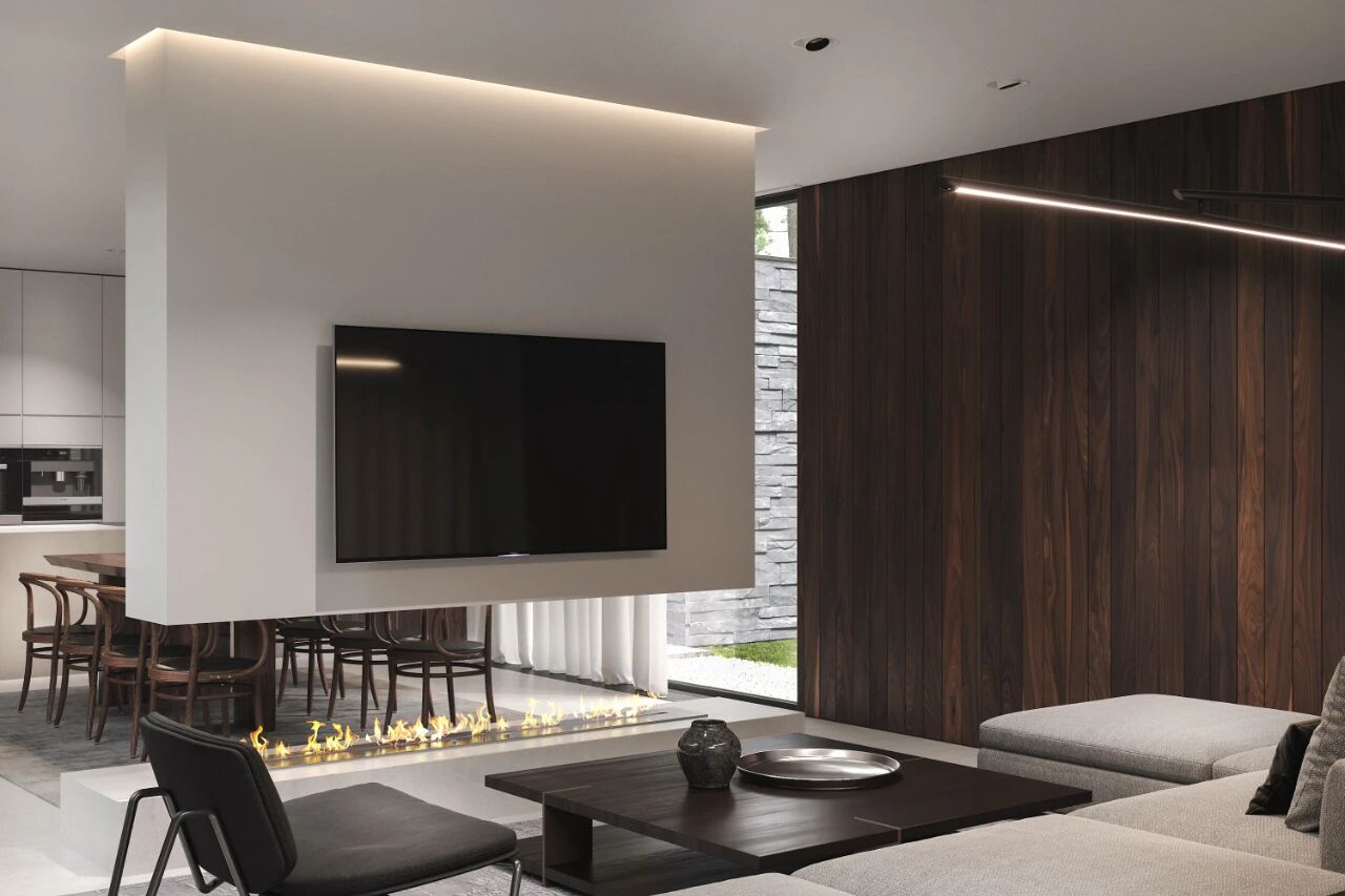 深色木饰面墙面与极简白墙形成强烈对比,嵌入式壁炉与悬浮电视墙让空间充满现代感。浅灰色布艺沙发与黑色茶几的搭配,进一步强化了冷静克制的氛围,适合追求个性与质感的都市人群。