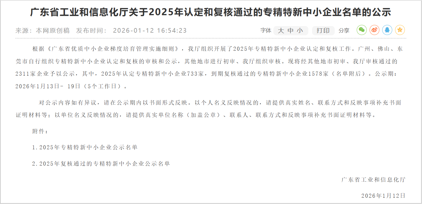 近日,广东省工业和信息化厅公示2025年专精特新中小企业复核结果,珠海水发新材料科技有限公司凭借在液晶调光膜细分领域的长期深耕、稳定的创新能力及精细化运营水平,顺利通过复核,继续保有省级“专精特新中小企业”资质。