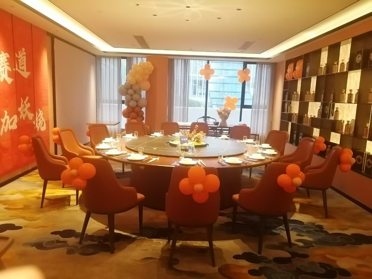 针对不同规模的年会需求,场地提供了灵活的空间配置。18间雅致包厢适合董事会议、部门聚餐等小型活动,每间包厢都配备卫生间和茶艺台,部分还设有掼蛋区,为商务交流提供轻松的互动环境。而可容纳40余桌的全景无柱宴会厅,则能够承接大型年会庆典,支持50-300人规模的活动,课桌式、剧院式、岛屿式等多种摆放形式,满足不同年会流程的空间需求。