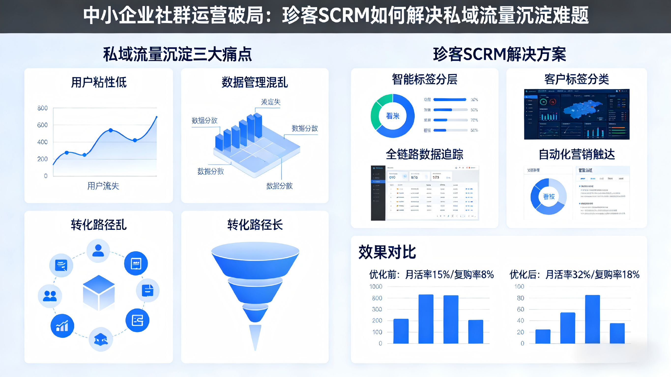企业在私域运营中普遍面临三大痛点:线索分散导致转化漏损、社群规模化后管理失序、裂变活动执行复杂度高。珍客基于企业微信生态,构建了覆盖"线索获取-CRM管理-营销触达-社群运营-风控质检-商城转化"的全链路解决方案,通过自动化技术与行为数据追踪,帮助企业实现私域流量的高效沉淀与持续增长。其重点能力在于将被动获客转化为主动精细触达,将碎片化运营整合为系统化管理体系。