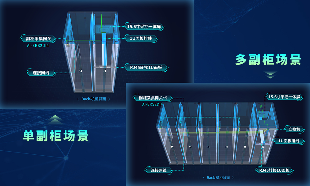 主柜配备15.6寸动环采控显一体屏,可选配1U转换面板,实现即插即用且无需理线;每个副柜通过1个AI-ERS2DI4 透传模块完成本柜数据采集处理,*需一根网线即可与主柜一体屏连接;在多副柜场景中,只需在主柜增设一个交换机,将一体屏及所有副柜的 AI-ERS2DI4 模块通过网线接入,就能完成快速完成多联柜集群搭建,整体架构简单可靠!