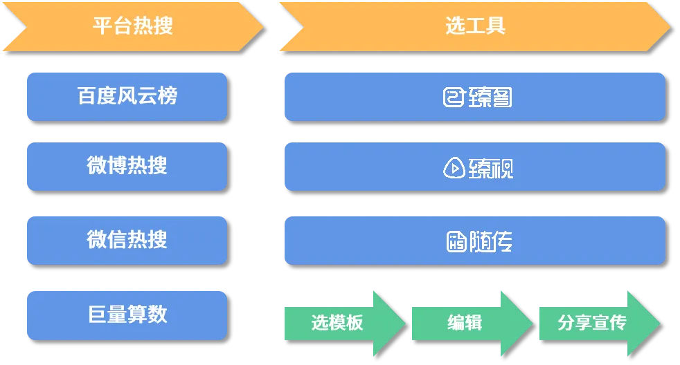 创作者或企业可以通过各平台的热搜榜来查找有热度的事件,借助T云的臻图、臻视、随传这样的内容创作工具快速响应。