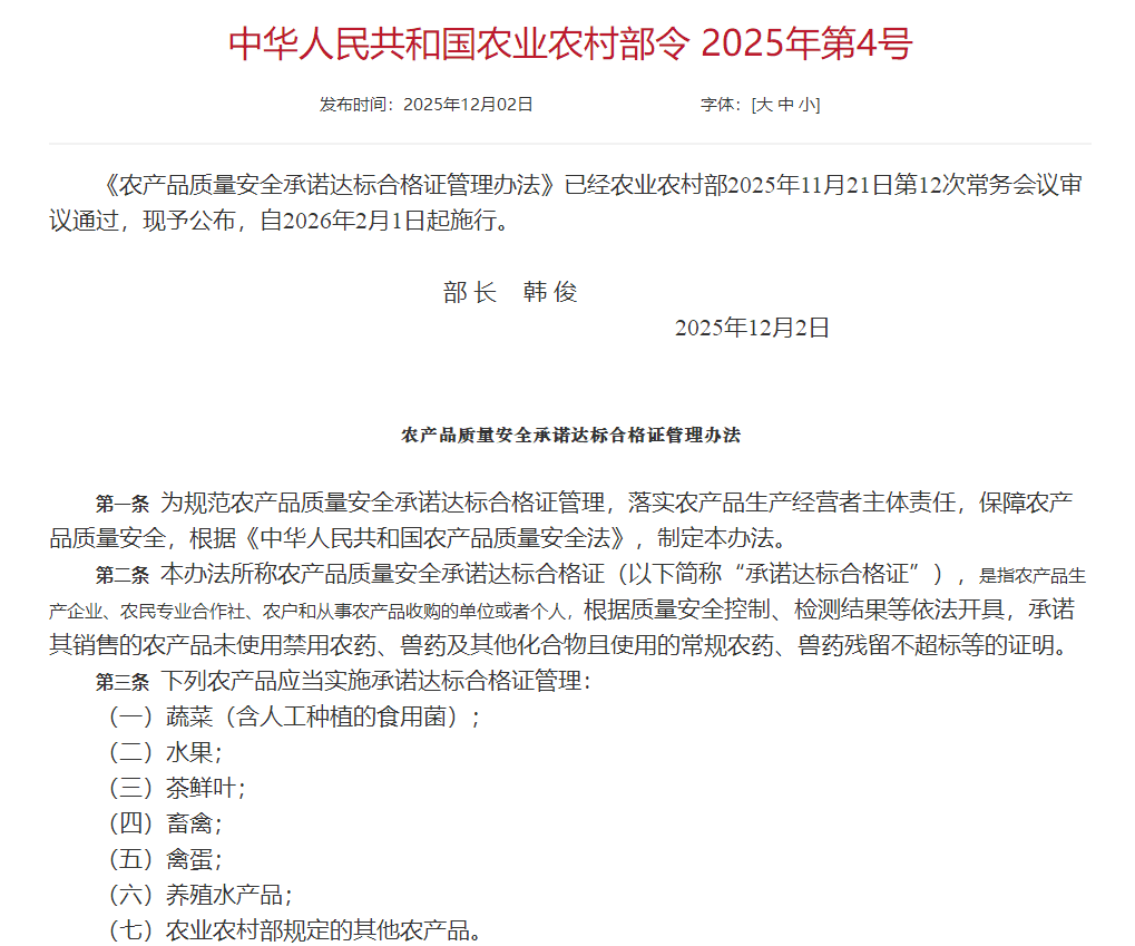 2026年2月1日起,国家农业农村部发布的《农产品质量安全法》配套新规正式实施,要求蔬菜、水果、畜禽、禽蛋、养殖水产品等五类食用农产品必须出具“农产品质量安全达标合格证”,这张“身份证”将成为农产品进入市场的首要凭证。这一政策的落地,标志着我国农产品质量安全管理进入全链条可追溯的新阶段。