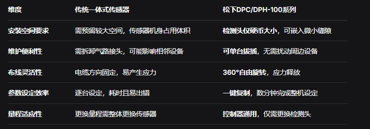 松下机电推出的DPC/DPH-100系列数字压力传感器,并非一次简单的产品迭代,该系列通过检测头与控制器分离架构,将安装的灵活性、操作便捷性与测量一致性融为一体,为现代精密制造提供了无损检测、迅速便捷的一体化解决方案。