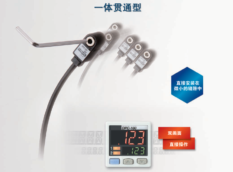 DPC/DPH-100系列的本质突破,在于其检测头与控制器分离的模块化架构;因为传统的一体式压力传感器,必须将整个带有电子元件的机身安装在气路接口上,这在空紧凑的现代设备中,已成为严重的瓶颈——检测位置往往空间狭小,而一体式传感器臃肿的机身难以安置;更棘手的是,一旦传感器需要维护或更换,必须拆卸整个气路连接,导致产线长时间的停机。但是,松下DPC/DPH-100系列彻底终结了这一困境;它将精密的传感单元与控制器DPC-100分离;其检测头只有相当于一枚硬币大小,就可轻松嵌入设备较为狭窄的缝隙;控制器则可集中安装于便于操作的面板或电控柜,二者通过一根普通的4芯电缆连接,较长的情况下可延展至10米。这一“分离即自由”的设计理念,带来的不只是安装位置的解放,更是对设备的设计自由度、产线的维护效率、系统长期可靠性,进行了多维的跃升。