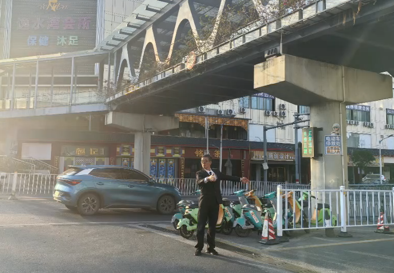 春节来商场购物的人多,开车来的也多。商场停车场在高峰期经常一位难求。广东华创保安服务有限公司的保安员在停车场入口处引导车辆,示意驾驶员哪边还有空位,哪边需要排队等候。有些司机着急找车位,容易插队或乱停,保安员需要在现场不断走动,提醒车辆按规定行驶,避免堵塞。