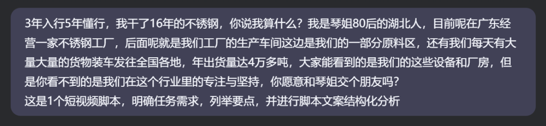 这是一篇制造业企业爆款短视频文案,我们利用Deepseek拆解这篇短视频文案,了解他的任务需求和结构化表达。