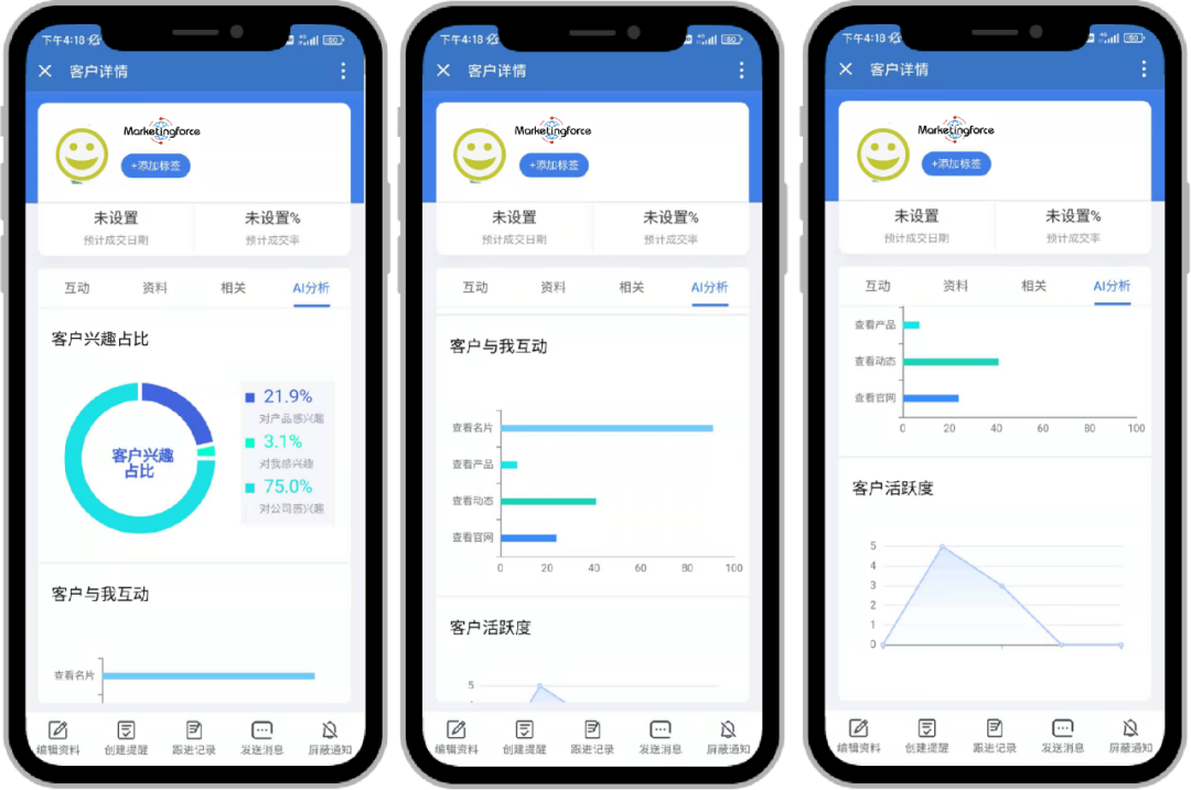 使用臻推宝移动CRM系统,智能分析客户兴趣和活跃度,大数据智能预测客户成交概率,找到活跃意向客户,重点进行维护。同时也能更了解客户状况,及时沟通跟进、进一步完成推广营销。