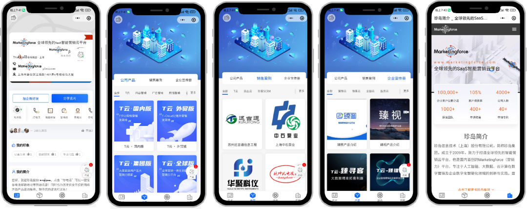 使用臻推宝智能名片功能,可将个人信息、公司产品、成功案例等模块搭建于名片之上,客户扫描二维码无需添加好友即可在小程序内开始沟通。可视化形式***展现公司产品优势,并减少客户冷却时间,抓住比较好沟通时间,随时随地展开对话。