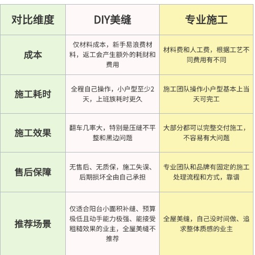 建议自己做美缝:装修预算极度紧张;美缝面积小(阳台、小卫生间);动手能力强、时间充裕;能接受返工风险,不怕吃苦受累。