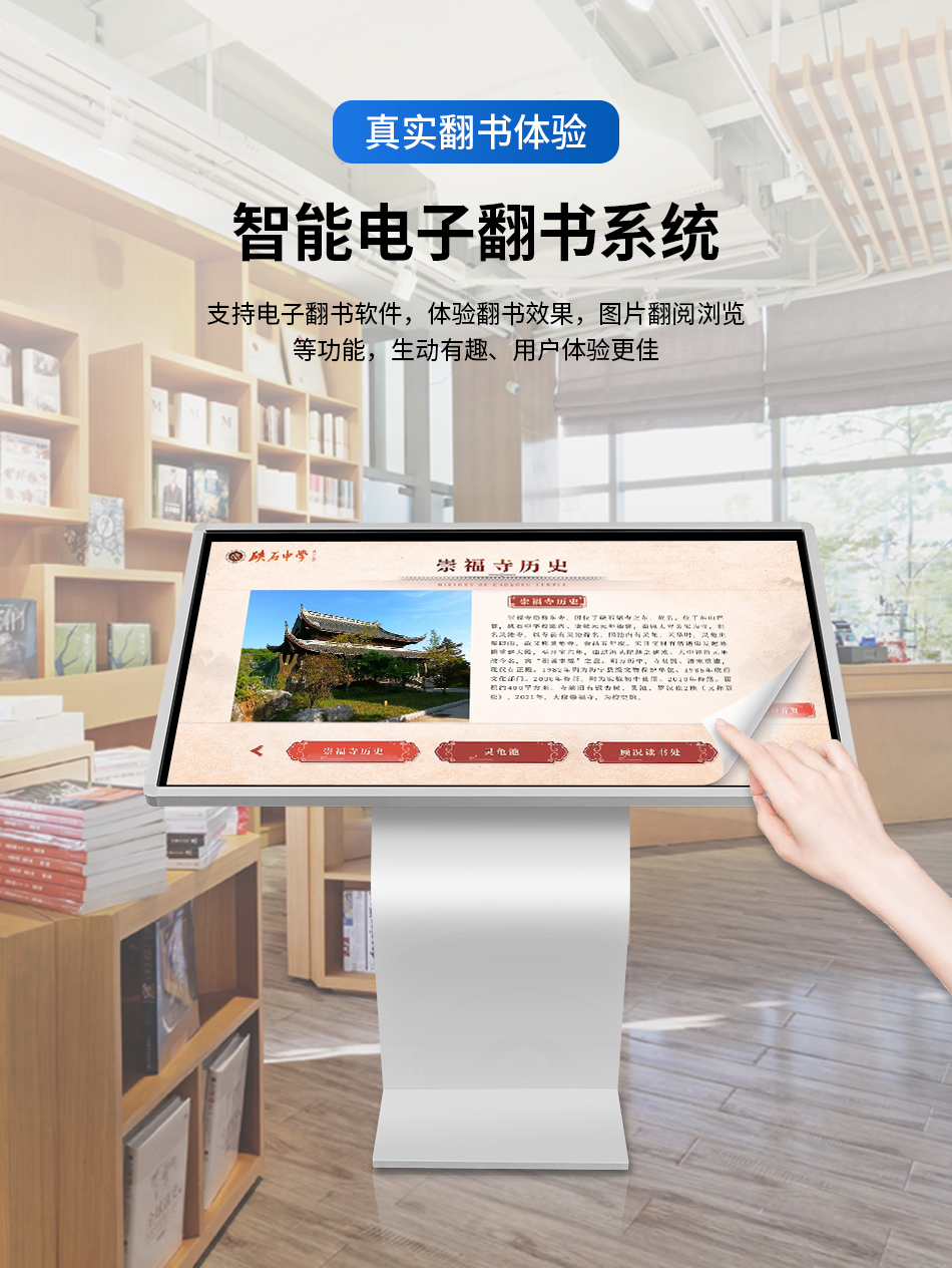 在文旅与公共场景,立式触摸一体机同样表现亮眼。某城市展馆引入设备作为导览终端,结合电子翻书系统与展馆二维码导览功能,让游客自主翻阅展馆资料、了解展品介绍,打造沉浸式观展体验;某公共阅览场馆将立式触摸一体机部署于阅览区域,使用者可自助查阅馆藏信息、检索书目资料,让资料查找更便捷。此外,在企业大厅、文创场馆、商业综合体等场景,上海霜赛立式触摸一体机也已广泛应用,成为信息发布、资料查询、品牌展示的重要载体。
