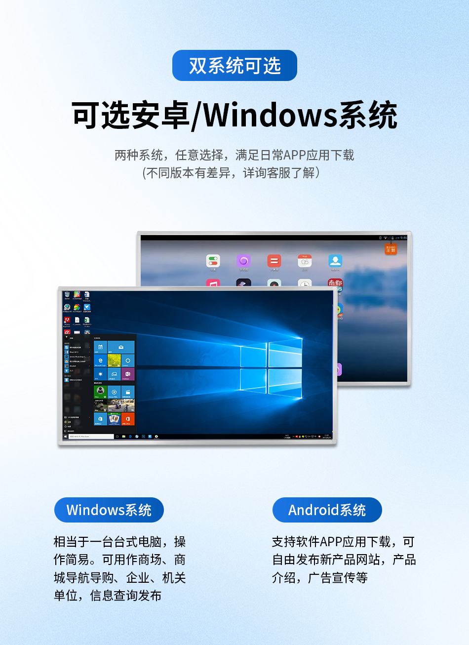 在功能拓展上,上海霜赛立式触摸一体机更贴合实际使用需求,内置无线 WIFI 模块,一键联网实现数据实时交互与信息灵活发布,让各类资讯、场景动态及时触达使用者;配备智能电子翻书系统,可实现生动的翻书体验,适用于展馆、图书场馆的资料翻阅,提升互动趣味性;内置多种分屏模版,支持音视频、图片、Word/Excel/PDF/PPT 等多格式文档同步展示,满足多元化信息呈现需求,同时支持定时开关功能,让设备管理更省心。此外,设备提供安卓 / Windows 双系统可选,Windows 系统操作简易等效台式电脑,适配各类服务大厅、企业的信息查询与内容展示;Android 系统支持 APP 自由下载,适用于商超、展馆的产品宣传与导航引导,双系统灵活切换,适配不同场景的功能需求。