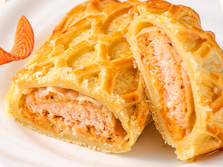 香,是层层递进的味觉盛宴。外层酥皮选用品质原料,经传统起酥工艺反复制作,层次分明、质地轻薄,烘烤后呈现均匀的金黄色,散发着浓郁的天然奶香味,轻轻一碰便酥香掉渣,香气瞬间弥漫。内里搭配匠心调配的鲜香馅料,与三文鱼的醇鲜完美融合,酥皮的焦香、黄油的醇香、鱼肉的鲜香交织在一起,入口香气醇厚不腻,回甘悠长,每一口都能感受到风味的碰撞与交融,唤醒沉睡的味蕾。