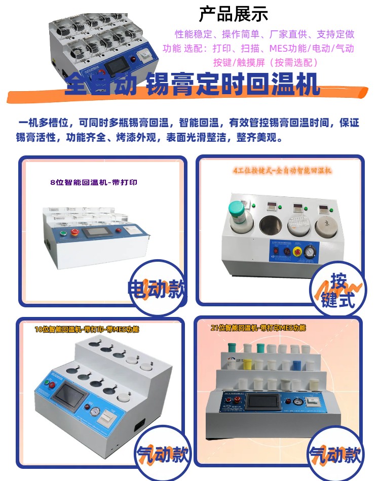 公司拥有20多年行业经验的技术研发团队,在SMT自动化设备与电子印刷设备领域积累了深厚的技术底蕴。其战略定位明确——以机器代替人工,为解决工业实现智能自动化、降低成本、减少人工、提高效益、创造价值。这种定位使得公司在提供锡膏回温等自动化设备时,能够从客户的实际生产痛点出发,提供切实可行的解决方案。