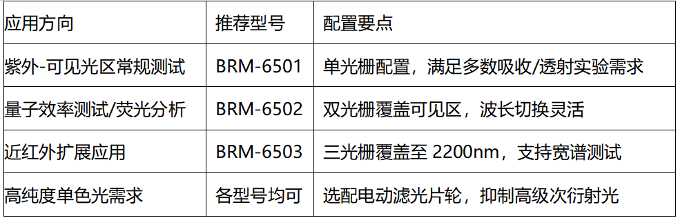 BRM-650X系列光栅单色仪,凭借其宽光谱覆盖能力与灵活配置选项,在多个技术应用领域展现出实用价值。本文将从应用角度出发,解析这款仪器在不同场景下的表现与配置思路。