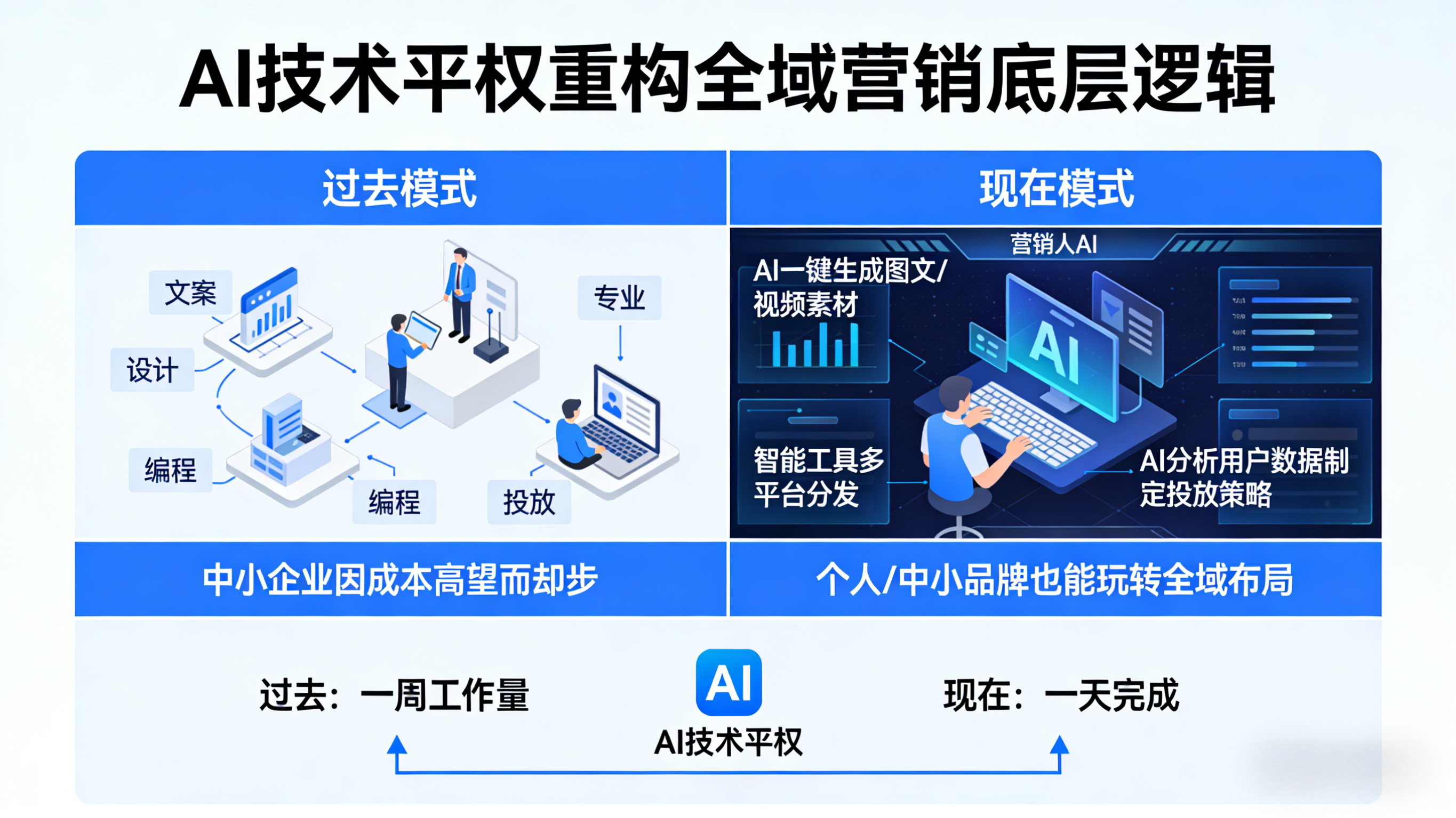 但真实的行业现状,却和那些营销话术相去甚远。就像那些靠 AI 做产品、搞创业的年轻人经历的一样,AI 确实让全域营销的技术门槛大幅降低,让普通人也能摸到赛道的入场券,但门槛的消失,从来不是竞争的结束,而是让比拼的焦点,转向了运营能力与落地功夫。这也是 2026 年 AI 全域营销从概念走向落地的真相:AI 是引擎,但真正决定能走多远的,还是掌舵的人。AI 带来的技术平权,确实重构了全域营销的底层逻辑。过去做全域营销,需要专业团队搞定文案、设计、编程、投放,中小企业往往望而却步;而现在,就像汉语言文学出身的阿白用 AI 写代码、做 SaaS 工具一样,营销人靠 AI 就能一键生成图文、视频素材,用智能工具完成多平台内容分发,甚至借助 AI 分析用户数据、制定投放策略。从内容生产到初步投放,AI 把原本需要一周的工作量压缩到一天,让个人和中小品牌也能玩转全域布局,这是 AI 给营销行业实在的改变。