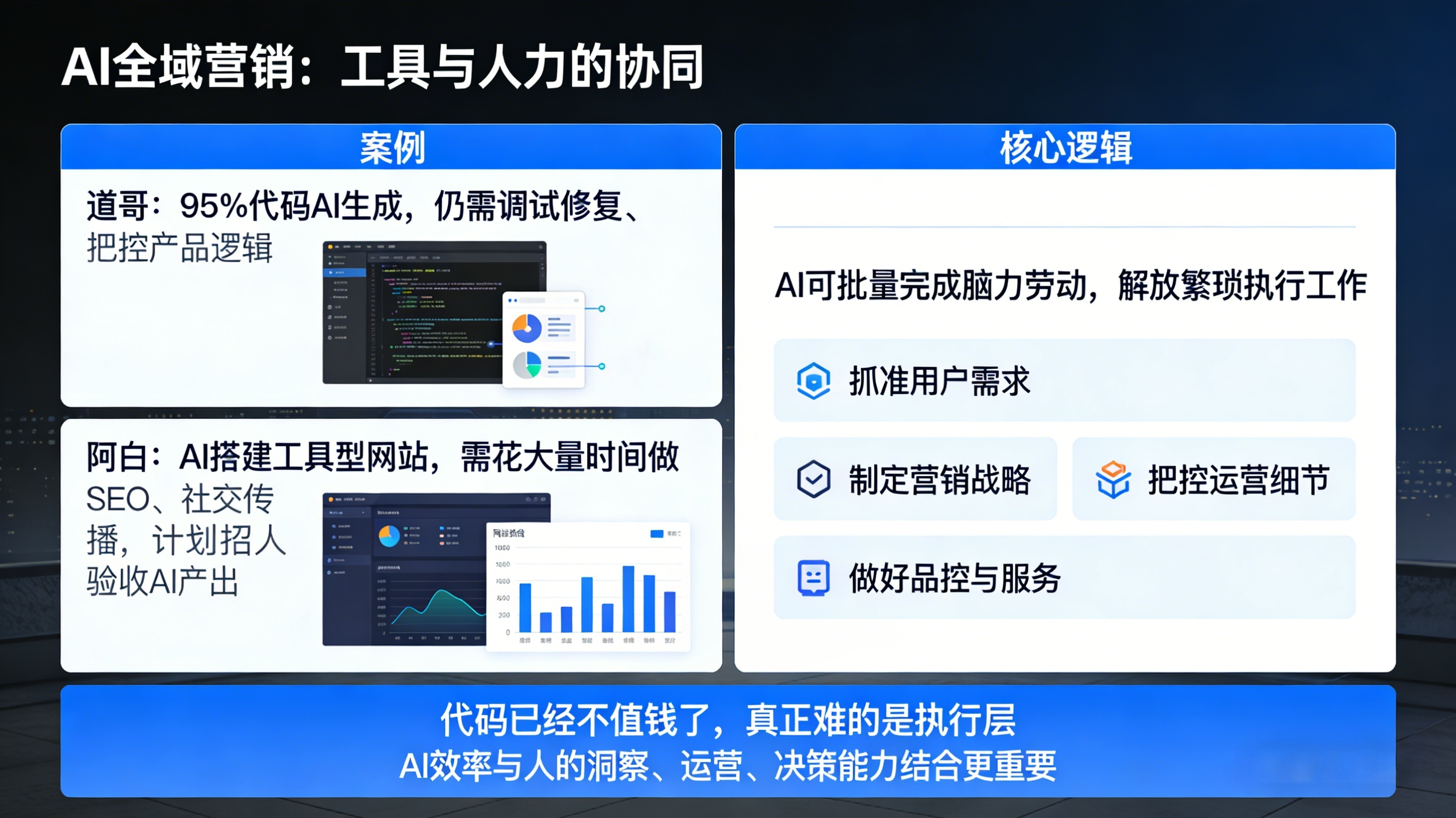 说到底,AI 从来都是全域营销的工具,而非解药。道哥 95% 的代码都由 AI 生成,但仍需要自己调试修复、把控产品逻辑;阿白靠 AI 搭建了多个工具型网站,却要花大量时间做 SEO、社交传播,甚至计划招人专门验收 AI 的产出。这和 AI 全域营销的逻辑一脉相承:AI 可以批量完成脑力劳动,把人从繁琐的执行工作中解放出来,但抓准用户需求、制定营销战略、把控运营细节、做好品控与服务,这些环节,终究需要人来掌舵。就像阿白总结的,“代码已经不值钱了,真正难的是执行层”,AI 全域营销的下半场,拼的从来不是谁的工具用得溜,而是谁能把 AI 的效率,和人的洞察、运营、决策能力结合得更好。