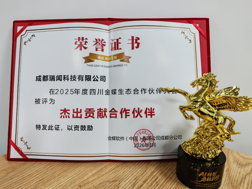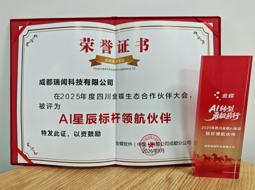 2026年3月24日,以「AI 转型 勇毅前行」为主题的2026年四川金蝶生态合作伙伴大会在成都圆满落幕,作为金蝶主要生态伙伴,成都瑞闻科技有限公司(以下简称“成都瑞闻”)受邀出席本次盛会,本次大会汇聚了金蝶四川分公司领导、全川生态伙伴及行业专业,共同探讨AI时代企业数字化转型的新路径与新机遇。成都瑞闻凭借在生态共建、客户服务与AI产品落地中的优异表现,一举斩获两项重磅荣誉: