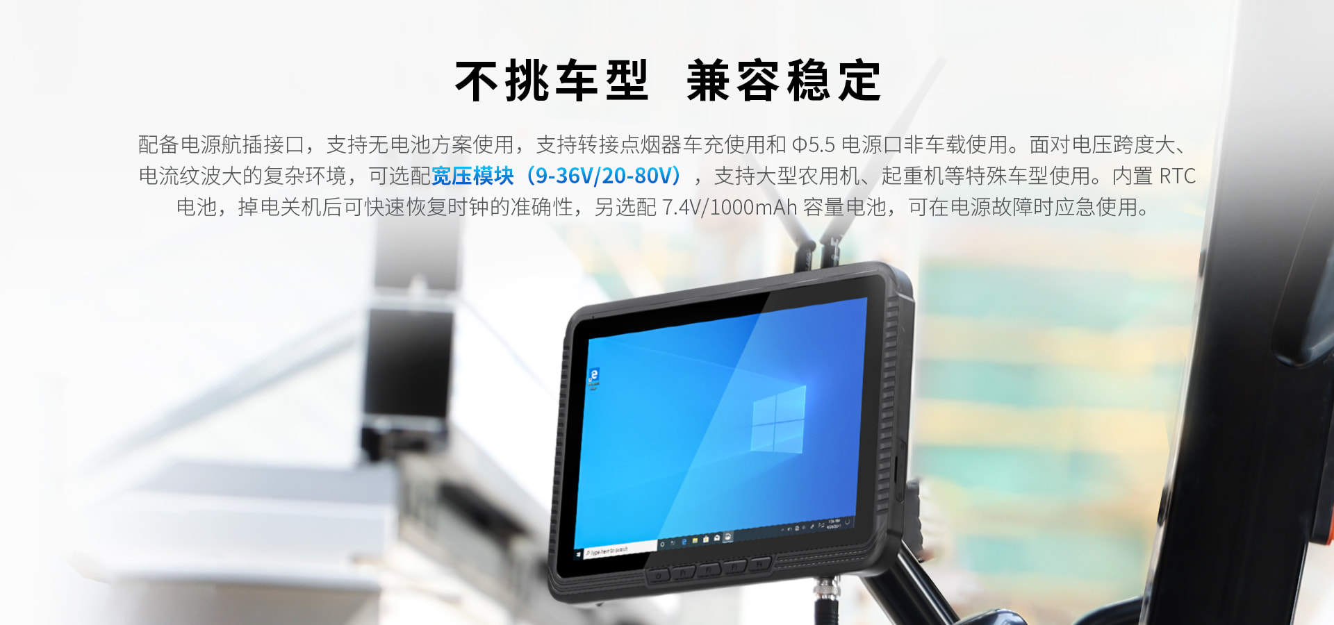 车载平板长期面对颠簸、粉尘、温湿度变化等复杂环境,耐用性直接影响使用体验。SS‑W1015J车载平板达到 IP65 防尘防水,可在 - 20℃至 60℃环境持续工作,通过抗振动测试,在起重机、叉车、货车等颠簸工况下保持结构与运行稳定。供电支持无电池方案,采用车规级 M12 航插接口,可转接点烟器或标准电源口,选配 9–36V/20–80V 宽压模块,适配工程车、农用车、环卫车等不同电压环境,内置 RTC 电池保持时钟稳定,选配备用电池应对临时断电,让作业过程更连贯。