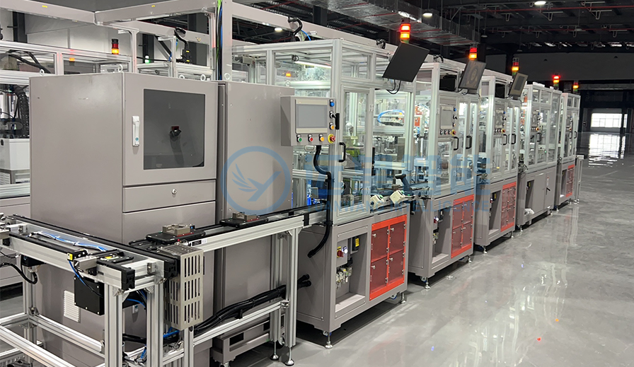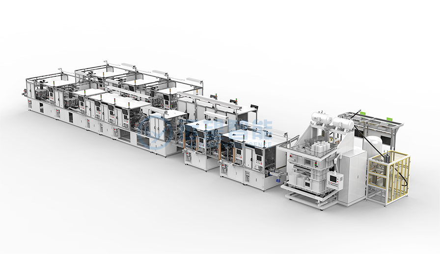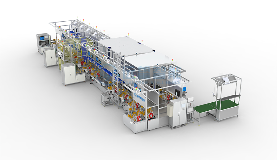 采用倍速链自动传送,可适应多版本切换;具备氦检漏、视觉引导自动送钉与锁付、视觉缺陷检测、自动涂油、伺服压装、EOL测试、气密性测试、激光打码等功能,并集成产线MES系统,CT时间<60S。