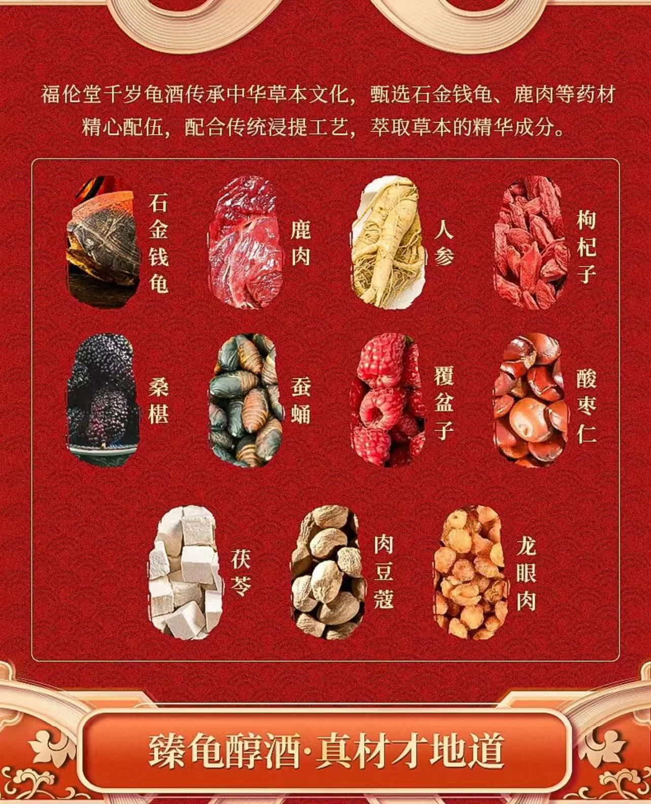 福伦堂千岁龟酒的成功,根植于其对“药食同源”这一中华养生文化精髓的坚守与发扬。产品严格遵循传统配伍智慧,以珍贵的石金钱龟为主要,佐以人参、茯苓、鹿肉、枸杞、桑葚、蚕蛹、覆盆子、酸枣仁、肉豆蔻、龙眼肉等十余种国家认可的药食同源药材。石金钱龟富含蛋白质、骨胶原、钙、肽类及多种微量元素,是滋阴潜阳、益肾健骨的珍品。通过“臻龟+醇酒”的经典架构,配合严谨的“君臣佐使”配伍,使动物精华与植物精粹在酒体中达成阴阳平衡、五脏同调的滋养理念,真正做到滴滴精粹。