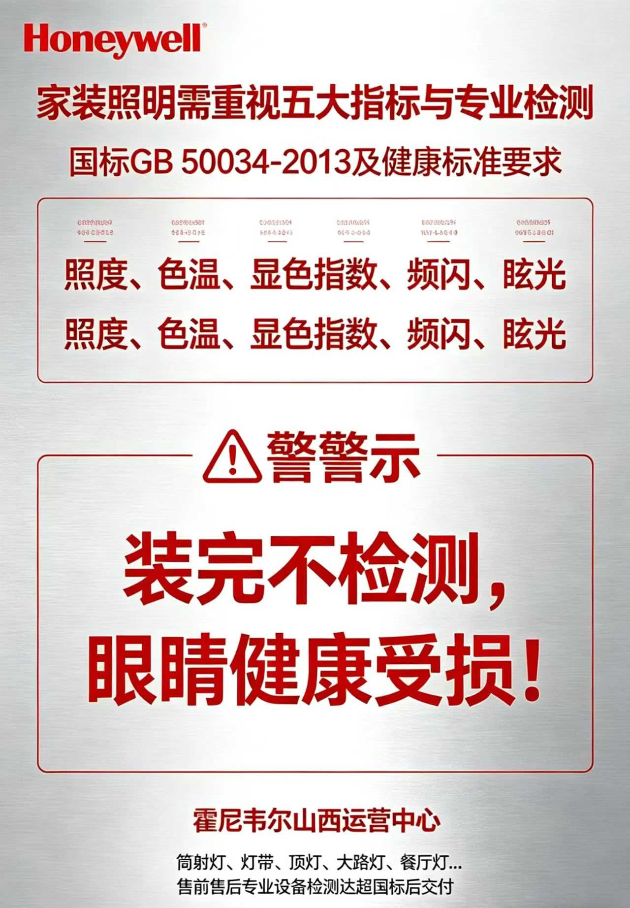 作为霍尼韦尔在山西区域的**运营主体,山西美电电器旗下山西霍尼韦尔运营中心始终将用户健康放在服务**,打造全流程专业照明检测服务。服务覆盖筒射灯、灯带、顶灯、路灯、餐厅灯等全品类照明产品,从售前方案设计到售后安装交付,全程采用专业检测设备,对标国标及健康标准逐项校验,确保各项指标远超国标要求后再完成交付,从源头杜绝不合格照明带来的眼健康隐患。