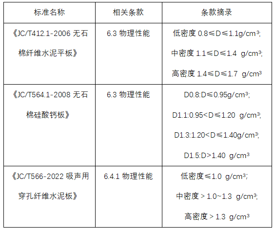我们都知道,纤维水泥板与硅酸钙板的现行行业标准颁布于2018年,从2018年9月1日开始实施,那么,在此之前的标准有没有关于“密度”更详细的规定呢?可别说,还真有。不仅《JC/T412.1-2006无石棉纤维水泥平板》与《JC/T564.1-2008无石棉硅酸钙板》中有与“密度”相关的表述,我们还在《JC/T566-2022吸声用穿孔纤维水泥板》标准中也找到了相关条款,但是综合起来,这些散落在不同已废止标准与现行标准中的有关条款,表述却并不一致,下面列表说明: